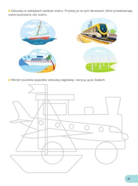 Odszukaj w naklejkach symbole wiatru. Przyklej je na tych obrazkach, które przedstawiają wykorzystywanie siły wiatru. Wśród rysunków pojazdów odszukaj żaglówkę i narysuj ją po śladach. 57