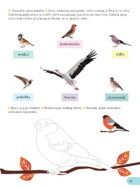 mieszka sowa. Odszukaj w naklejkach zwierzęta. Naklej je w odpowiednich miejscach. Czerwoną pętlą otocz te z nich, które opuszczają nasz kraj na czas zimy. Zieloną pętlą
