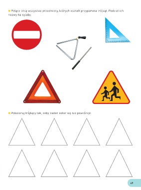Połącz linią wszystkie przedmioty, których kształt przypomina trójkąt. Podziel ich nazwy na sylaby. Pokoloruj trójkąty tak, żeby żaden kolor się nie powtórzył. 69