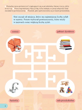 Posłuchaj nazw pomieszczeń znajdujących się w przedszkolu. Nazwij rzeczy, które
