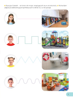 Rysuj po śladach – od dzieci do miejsc znajdujących się w przedszkolu. Na każdym zdjęciu przedstawiającym pomieszczenie skreśl to, co nie pasuje. 7