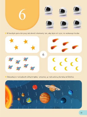 6 W każdym polu dorysuj lub skreśl elementy tak, aby było ich tyle, ile wskazuje liczba. 6 Odszukaj w naklejkach żółtą kropkę i przyklej ją nad szóstą planetą od Słońca. 13