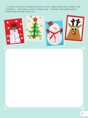 To kartki świąteczne zaprojektowane przez dzieci. Wskaż kartkę, która podoba ci się najbardziej. Zaprojektuj w ramce własną kartkę. Powiedz, komu podarowałbyś/ podarowałabyś kartkę świąteczną. 37
