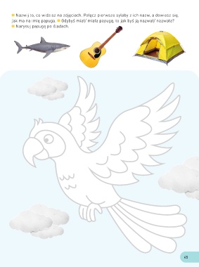 Nazwij to, co widzisz na zdjęciach. Połącz pierwsze sylaby z ich nazw, a dowiesz się, jak ma na imię papuga. Gdybyś miał/ miała papugę, to jak byś ją nazwał/ nazwała? Narysuj papugę po śladach. 45