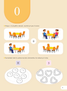 0 Połącz z liczbą 0 te obrazki, na których jest 0 dzieci. 0 Na każdym talerzu pokoloruj tyle elementów, ile wskazuje liczba. 0 3 5