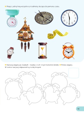 Połącz jedną linią wszystkie przedmioty służące do pomiaru czasu. Narysuj zegary po śladach – każdy z nich innym kolorem kredki. Policz zegary. W ramce narysuj odpowiednią liczbę kropek. 53