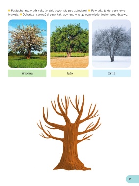 Posłuchaj nazw pór roku znajdujących się pod zdjęciami. Powiedz, jakiej pory roku brakuje. Dokończ rysować drzewo tak, aby jego wygląd odpowiadał jesiennemu drzewu. wiosna lato zima 57