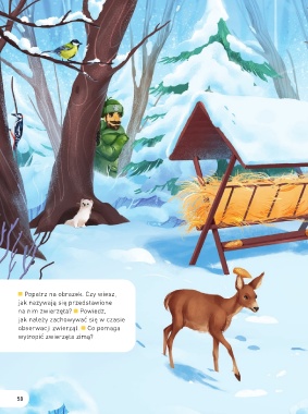 Popatrz na obrazek. Czy wiesz, jak nazywają się przedstawione na nim zwierzęta? Powiedz, jak należy zachowywać się w czasie obserwacji zwierząt. Co pomaga wytropić zwierzęta zimą? 58