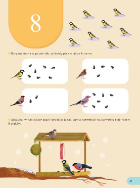 8 Dorysuj ziarna w polach tak, by każdy ptak miał po 8 ziaren. Odszukaj w naklejkach ptaki i przyklej je tak, aby w karmniku i na karmniku było razem 8 ptaków. 61