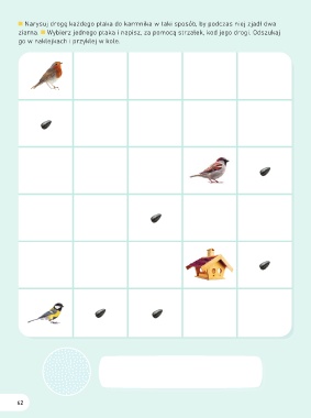 Narysuj drogę każdego ptaka do karmnika w taki sposób, by podczas niej zjadł dwa ziarna. Wybierz jednego ptaka i napisz, za pomocą strzałek, kod jego drogi. Odszukaj go w naklejkach i przyklej w kole. 62