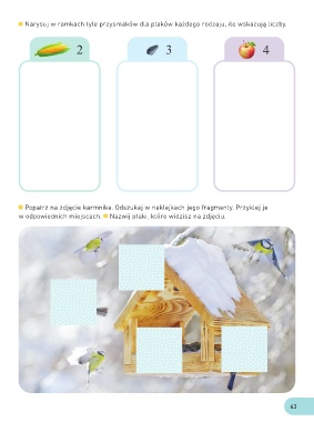 Narysuj w ramkach tyle przysmaków dla ptaków każdego rodzaju, ile wskazują liczby. 2 3 4 Popatrz na zdjęcie karmnika. Odszukaj w naklejkach jego fragmenty. Przyklej je w odpowiednich miejscach. Nazwij ptaki, które widzisz na zdjęciu. 63