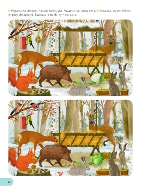 Popatrz na obrazki. Nazwij zwierzęta. Powiedz, co jedzą zimą. Odszukaj osiem różnic między obrazkami. Zaznacz je na dolnym obrazku. 64