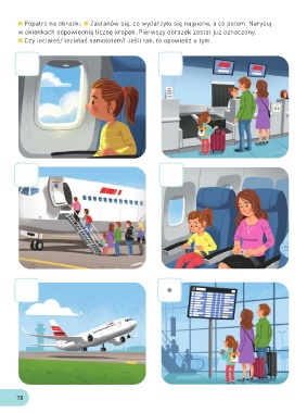 Popatrz na obrazki. Zastanów się, co wydarzyło się najpierw, a co potem. Narysuj w okienkach odpowiednią liczbę kropek. Pierwszy obrazek został już oznaczony. Czy leciałeś/ leciałaś samolotem? Jeśli tak, to opowiedz o tym. 78