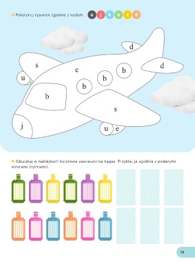 Pokoloruj rysunek zgodnie z kodem. u j b s e d d s e b d u b e b b s j u e Odszukaj w naklejkach kolorowe zawieszki na bagaż. Przyklej je zgodnie z podanymi wzorami (rytmami). 79