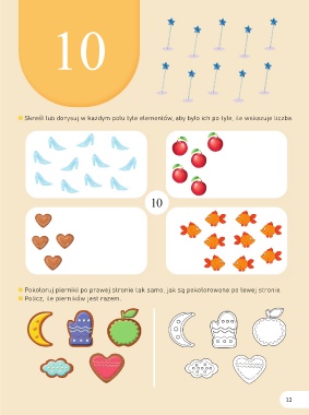 10 Skreśl lub dorysuj w każdym polu tyle elementów, aby było ich po tyle, ile wskazuje liczba. 10 Pokoloruj pierniki po prawej stronie tak samo, jak są pokolorowane po lewej stronie. Policz, ile pierników jest razem. 13