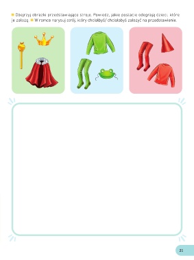 Obejrzyj obrazki przedstawiające stroje. Powiedz, jakie postacie odegrają dzieci, które je założą. W ramce narysuj strój, który chciałbyś/ chciałabyś założyć na przedstawienie. 21