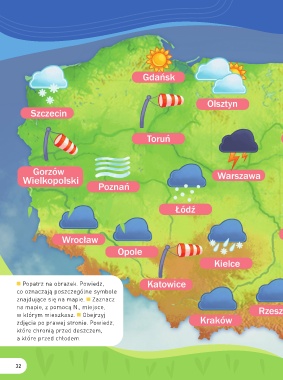 Popatrz na obrazek. Powiedz, co oznaczają poszczególne symbole znajdujące się na mapie. Zaznacz na mapie, z pomocą N., miejsce, w którym mieszkasz. Obejrzyj zdjęcia po prawej stronie. Powiedz, które chronią przed deszczem, a które przed chłodem. 32