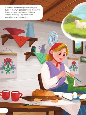 Popatrz na obrazek przedstawiający życie w dawnym gospodarstwie domowym. Powiedz, co na nim widzisz. Wskaż i nazwij produkty i wytwory, które zawdzięczamy zwierzętom. 48