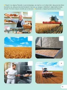 Popatrz na zdjęcia. Powiedz, co przedstawiają. Jak myślisz, co trzeba zrobić, aby powstał chleb.