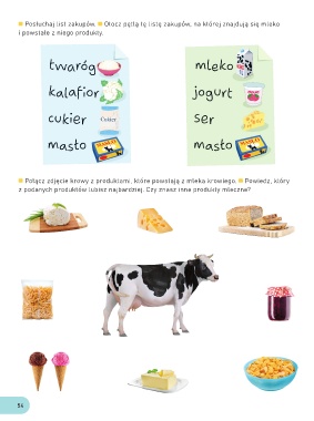 Połącz zdjęcie krowy z produktami, które powstają z mleka krowiego. Powiedz, który