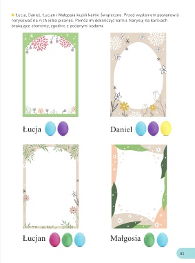 Łucja, Daniel, Łucjan i Małgosia kupili kartki świąteczne. Przed wysłaniem postanowili narysować na nich kilka pisanek. Pomóż im dokończyć kartki. Narysuj na kartkach brakujące elementy, zgodnie z podanymi kodami. Łucja Daniel Łucjan Małgosia 61