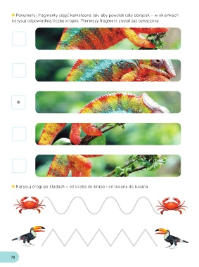 Ponumeruj fragmenty zdjęć kameleona tak, aby powstał cały obrazek – w okienkach narysuj odpowiednią liczbę kropek. Pierwszy fragment został już oznaczony. Narysuj drogi po śladach – od kraba do kraba i od tukana do tukana. 78