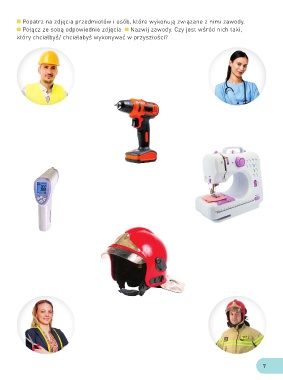 Popatrz na zdjęcia przedmiotów i osób, które wykonują związane z nimi zawody. Połącz ze sobą odpowiednie zdjęcia. Nazwij zawody. Czy jest wśród nich taki, który chciałbyś/ chciałabyś wykonywać w przyszłości? 7