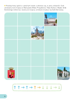 Pokonaj trasę zgodnie z podanym kodem, a dowiesz się, w jakiej kolejności Olek zwiedzał znane miejsca w Warszawie (Pałac Prezydencki, Pałac Kultury i Nauki, Grób Nieznanego Żołnierza). Zacznij od miejsca, w którym znajduje się herb Warszawy. 14