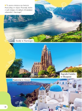 To znane miejsca na świecie. Posłuchaj ich nazw. Powiedz, które z tych miejsc chciałbyś /chciałabyś odwiedzić. Dlaczego? fiordy w Norwegii Sagrada Familia w Hiszpanii Santorini w Grecji 18
