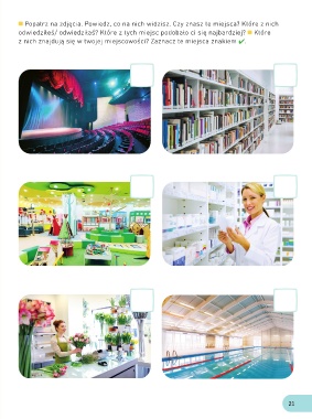 Popatrz na zdjęcia. Powiedz, co na nich widzisz. Czy znasz te miejsca? Które z nich odwiedziłeś/ odwiedziłaś? Które z tych miejsc podobało ci się najbardziej? Które z nich znajdują się w twojej miejscowości? Zaznacz te miejsca znakiem . 21