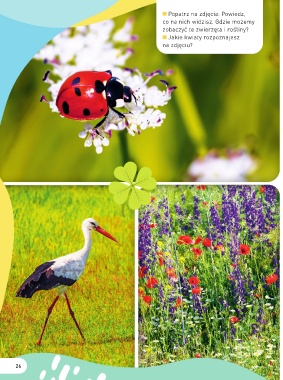 Popatrz na zdjęcia. Powiedz, co na nich widzisz. Gdzie możemy zobaczyć te zwierzęta i rośliny? Jakie kwiaty rozpoznajesz na zdjęciu? 26