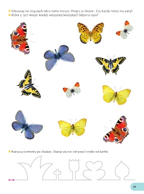 Odszukaj na zdjęciach takie same motyle. Połącz je liniami. Czy każdy motyl ma parę? Które z tych motyli kiedyś widziałeś/widziałaś? Gdzie to było? Narysuj elementy po śladzie. Staraj się nie odrywać kredki od kartki. 29