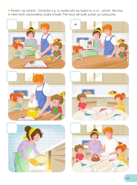 Popatrz na obrazki. Zastanów się, co wydarzyło się najpierw, a co – potem. Narysuj w okienkach odpowiednią liczbę kropek. Pierwszy obrazek został już oznaczony. 41
