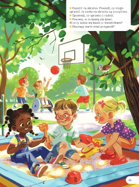 Popatrz na obrazek. Powiedz, co mogło sprawić, że osoby na obrazku są szczęśliwe. Opowiedz, co sprawia ci radość. Powiedz, w co bawią się dzieci. W co ty lubisz się bawić z rówieśnikami? Dlaczego warto mieć przyjaciół? 43