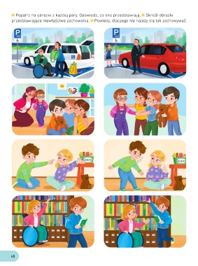 Popatrz na obrazki z każdej pary. Opowiedz, co one przedstawiają. Skreśl obrazki przedstawiające niewłaściwe zachowania. Powiedz, dlaczego nie należy się tak zachowywać. 48