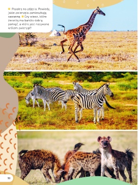 Popatrz na zdjęcia. Powiedz, jakie zwierzęta zamieszkują sawannę. Czy wiesz, które zwierzę ma bardzo dobrą pamięć, a które jest nazywane królem zwierząt? 50