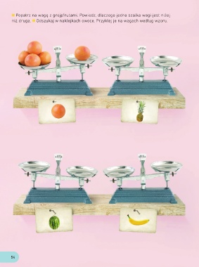 Popatrz na wagę z grejpfrutami. Powiedz, dlaczego jedna szalka wagi jest niżej niż druga. Odszukaj w naklejkach owoce. Przyklej je na wagach według wzoru. 54