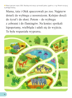 Pokaż palcem napis ZOO. Słuchaj instrukcji i prowadź palec zgodnie z nią. Potem narysuj