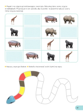 Popatrz na zdjęcia przedstawiające zwierzęta. Odszukaj takie same zdjęcia w naklejkach. Przyklej je w taki sposób, aby w pionie i w poziomie były po cztery różne zdjęcia zwierząt. Narysuj węża po śladzie. Dokończ kolorować wzór (rytm) na wężu. 57