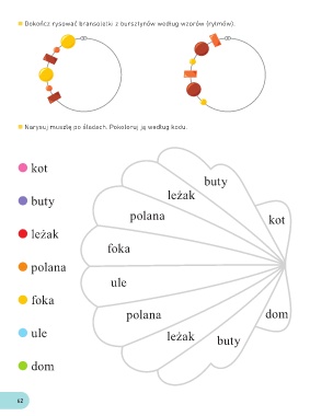 Dokończ rysować bransoletki z bursztynów według wzorów (rytmów). Narysuj muszlę po śladach. Pokoloruj ją według kodu. kot buty buty leżak polana kot leżak foka polana ule foka polana dom ule leżak buty dom 62