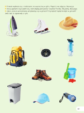 Franek wybiera się z rodzicami na wycieczkę w góry. Popatrz na zdjęcia. Nazwij je.