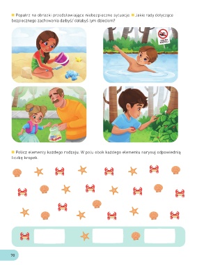 Popatrz na obrazki przedstawiające niebezpieczne sytuacje. Jakie rady dotyczące bezpiecznego zachowania dałbyś/ dałabyś tym dzieciom? Policz elementy każdego rodzaju. W polu obok każdego elementu narysuj odpowiednią liczbę kropek. 70