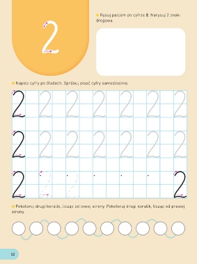 Rysuj palcem po cyfrze 2. Narysuj 2 znaki drogowe. Napisz cyfry po śladach. Spróbuj pisać cyfry samodzielnie. Pokoloruj drugi koralik, licząc od lewej strony. Pokoloruj drugi koralik, licząc od prawej strony. 12
