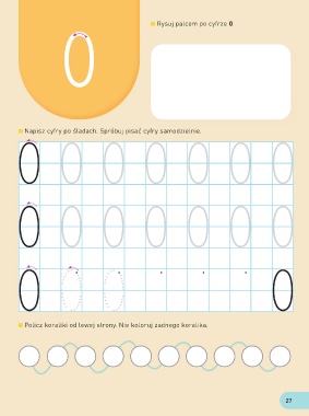 Rysuj palcem po cyfrze 0. Napisz cyfry po śladach. Spróbuj pisać cyfry samodzielnie. Policz koraliki od lewej strony. Nie koloruj żadnego koralika. 27