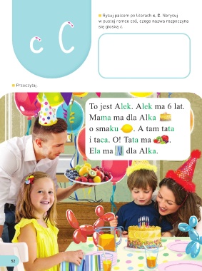 Rysuj palcem po literach c, C. Narysuj c c CC się głoską c. w pustej ramce coś, czego nazwa rozpoczyna Przeczytaj. To jest Alek. Alek ma 6 lat. Mama ma dla Alka o smaku . A tam tata i taca. O! Tata ma . Ela ma dla Alka. 52