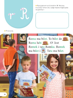 Rysuj palcem po literach r, R. Narysuj r RR r się głoską r. w pustej ramce coś, czego nazwa rozpoczyna Przeczytaj. Roma ma bilet. To bilet do . Roma lubi . O! Jest Romek i tata Romka. Romek ma bilet i . Tata ma bilet. 58