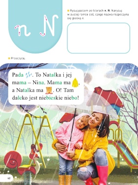 Rysuj palcem po literach n, N. Narysuj n NN się głoską n. n w pustej ramce coś, czego nazwa rozpoczyna Przeczytaj. Pada . To Natalka i jej mama – Nina. Mama ma , a Natalka ma . O! Tam daleko jest niebieskie niebo! 62