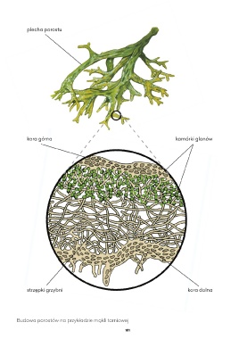 plecha porostu kora górna komórki glonów strzępki grzybni kora dolna Budowa porostów na przykładzie mąkli tarniowej 101