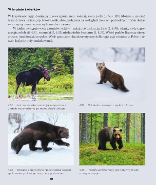 nostaje, sobole (il. 4.31), rosomaki (il. 4.32), niedźwiedzie brunatne (il. 4.33). Wśród ptaków liczne są sikory,