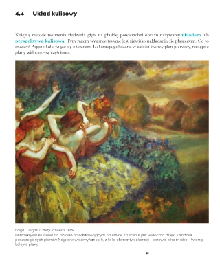 Perspektywa kulisowa na obrazie przedstawiającym baletnice na scenie jest widoczna dzięki układowi